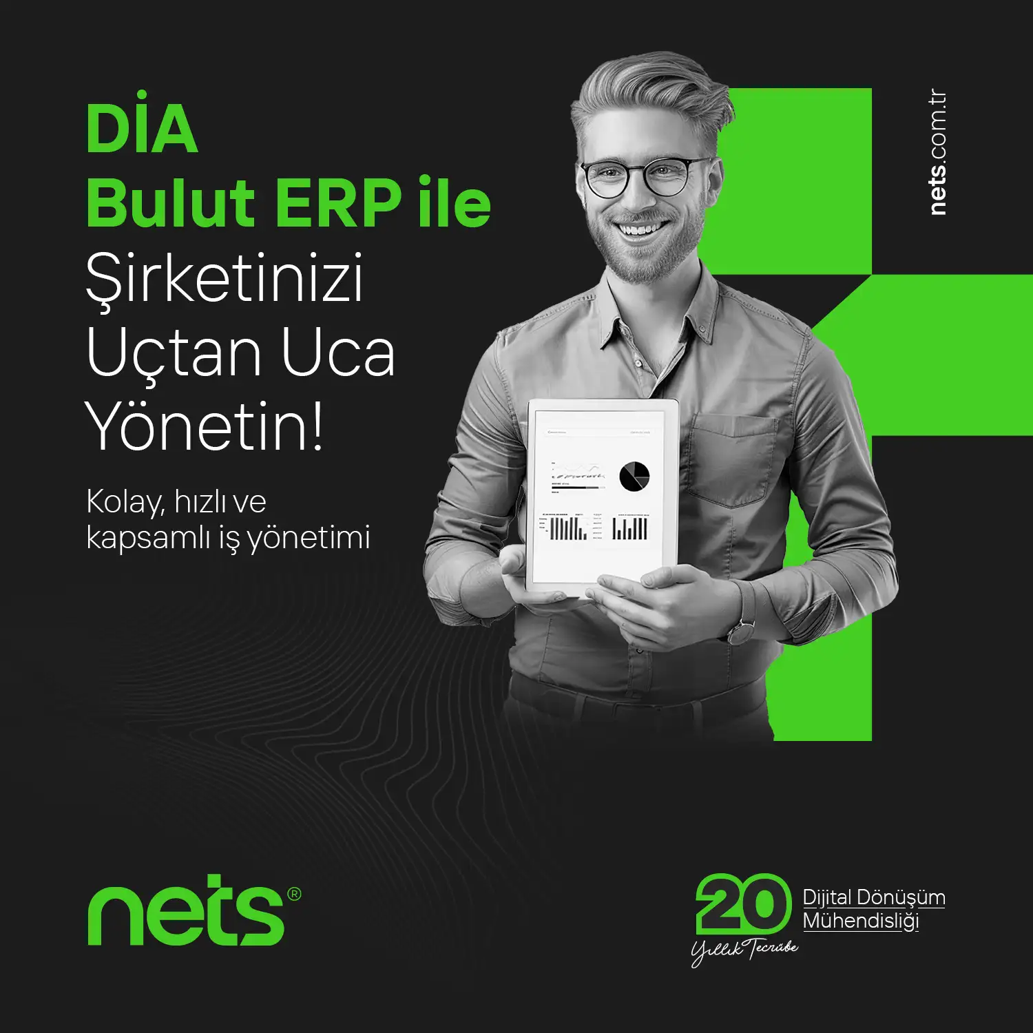 DİA Bulut ERP ile işletmenizin verimliliğini artırmak ve rekabet avantajı elde etmek için NETS Yazılım olarak yanınızdayız. Gelin, birlikte dijital dönüşüm yolculuğuna adım atalım.